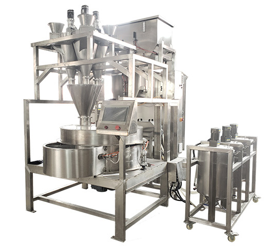PLC自動化控制,原料、粉劑、料液自動補充,裹衣過程根據(jù)工藝改變添加參數(shù)及節(jié)奏,亦可根據(jù)粉劑種類的不同添加多個料筒,滿足了各類產(chǎn)品的工藝要求。密閉式結構,改善了傳統(tǒng)加工過程粉塵污染問題。一鍵式智能操作高度自動化,大大的減少了勞動強度和對工人裹衣技術的依賴;使裹衣質量、均勻度不在受人為因素影響;實現(xiàn)了一人多機,高產(chǎn)量高質量的自動化生產(chǎn)。